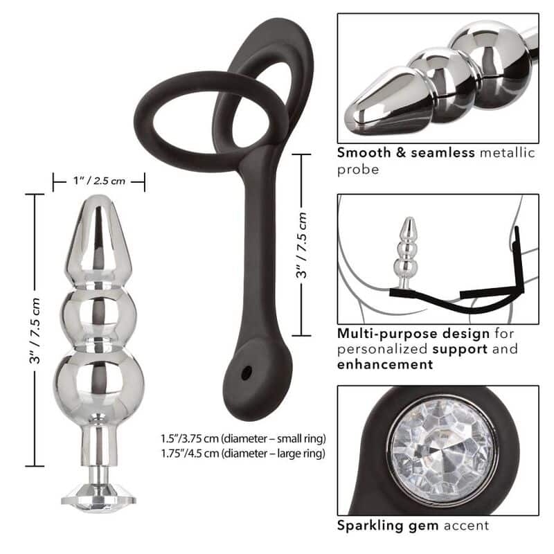 Décollez vers un univers de plaisir personnalisé avec le Star Fucker Beaded Plug. Un double rehausseur en silicone extensible est associé à une sonde métallique élégante et sans couture pour un support polyvalent, une amélioration et même un jeu de température alléchant. Le double rehausseur en silicone souple a été créé pour augmenter lendurance, améliorer la sensibilité et offrir un soutien dérection supérieur. Soyez ludique en utilisant ensemble le double amplificateur et la sonde métallique, et n’oubliez pas qu’ils peuvent être démontés pour un nettoyage facile. La sonde flexible est fabriquée à partir d’un alliage d’aluminium lisse et sans soudure qui retient la chaleur ou le froid pour une expérience de jeu de température unique en son genre. Pendant que vous élargissez vos horizons avec ce plug perlé élégant, utilisez la base ornée de pierres précieuses étincelantes pour une stimulation torride, une insertion sans effort et un retrait en douceur. La vue est encore meilleure de derrière grâce à la base de pierres précieuses étincelantes.