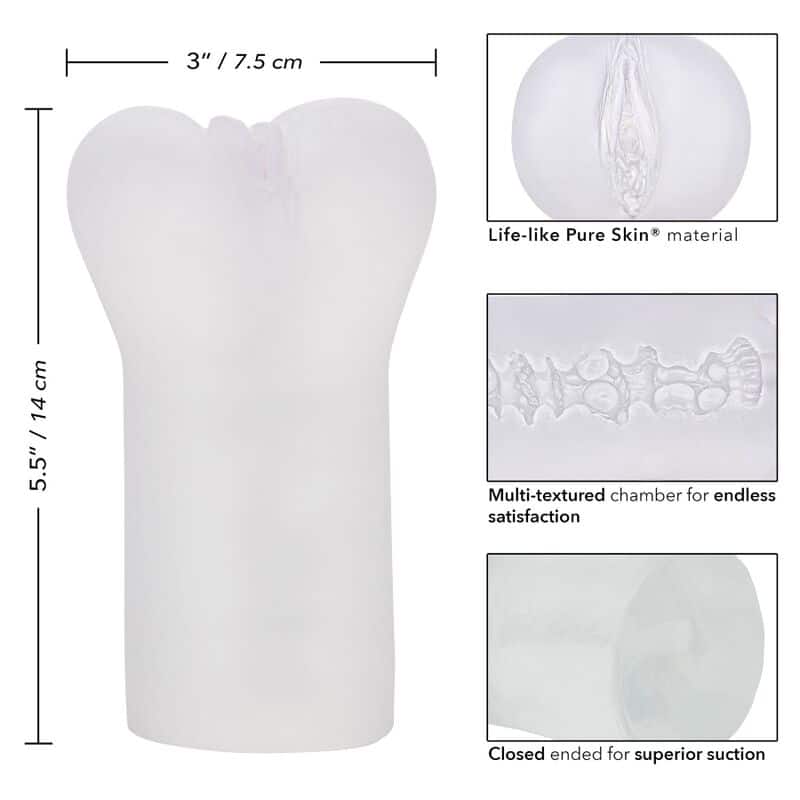 Vulve illimitée Informations supplémentaires Matériau Pure Skin réaliste Doux, serré et extensible Chambre multi-texturée pour une satisfaction sans fin Extrémité fermée pour une aspiration supérieure Hygiéniquement supérieur et sans entretien