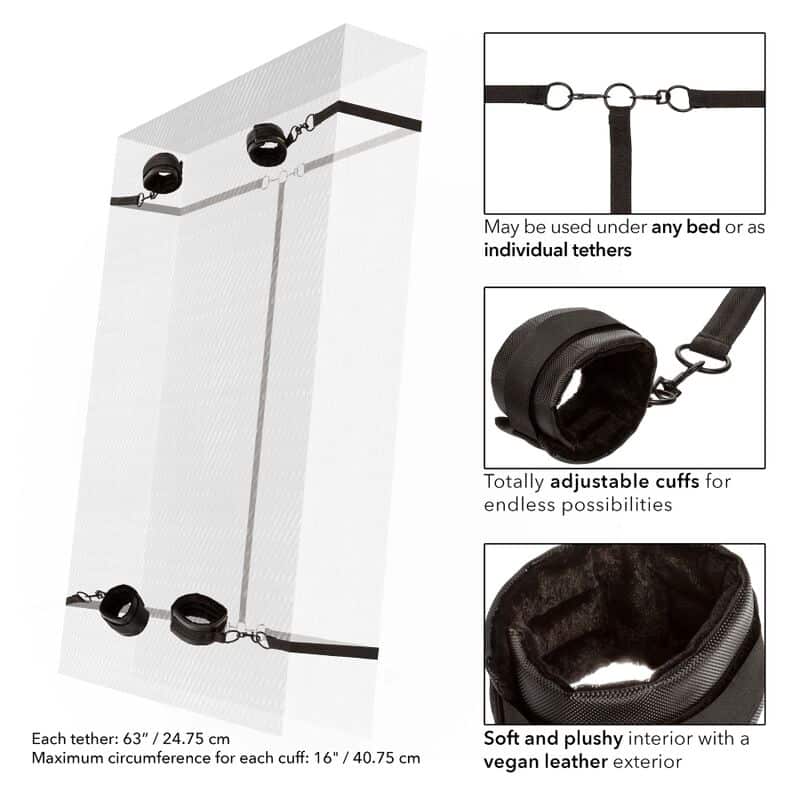 - 4 poignets ou chevilles totalement réglables et détachables 4 attaches robustes et réglables pour s’adapter à la plupart des matelas Peut être utilisé sous n’importe quel lit ou comme attaches individuelles Fermoirs universels et joints toriques avec conception pivotante pour une dextérité totale Intérieur doux et moelleux avec un extérieur en cuir végétalien Double rembourrage, double couture Design fonctionnel, durable et texturé