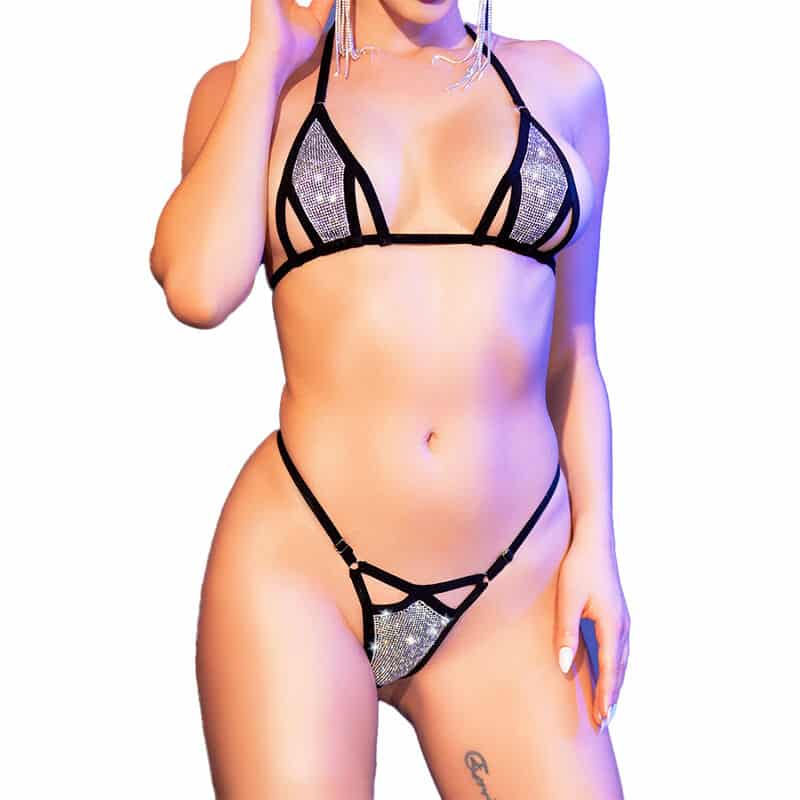 - CR-4659 Ensemble soutien-gorge/mini bikini noir/argenté avec cristaux brillants