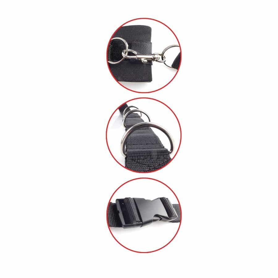 Chaque sangle de tension comporte 6 anneaux en D métalliques qui vous permettent d’attacher les attaches où vous le souhaitez, créant ainsi des scénarios de bondage élaborés sans faire de nœuds ni utiliser de matériel. Le kit peut être utilisé avec nimporte quelle taille de matelas et sinstalle facilement en quelques minutes. Il est parfait pour les lits sans montants de lit et peut également être utilisé sur les canapés. Les quatre attaches en nylon réglables sont dotées de clips métalliques robustes qui se connectent aux anneaux en D de la sangle de tension à une extrémité et aux poignets réglables de l’autre. Faites simplement glisser la sangle de tension autour de votre tête de lit, tirez la sangle jusqu’à ce qu’elle soit serrée, puis fermez la pince autobloquante pour maintenir la sangle en place.