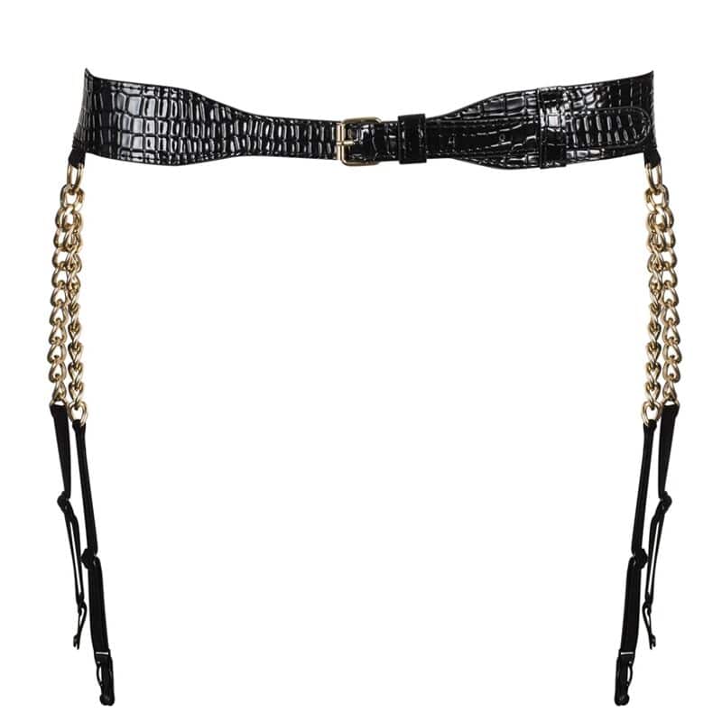 - Porte-jarretelles composés d’une combinaison de matière noire et de chaînes dorées