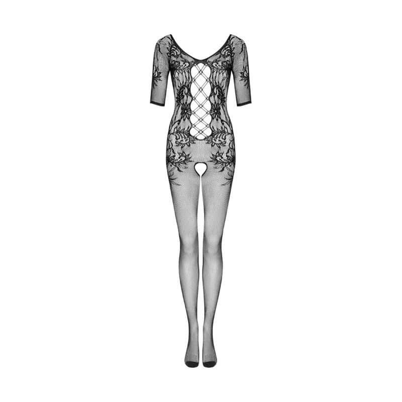 Maille noire à motif floral et manches courtes, avec des rayures traversant la poitrine et le ventre, et enfin, un dos très bien accentué. C’est un bodystocking qui peut vous laisser bouche bée, et l’entrejambe ouvert est un élément confortable et très tentant dans la chambre. Vérifiez-le!
