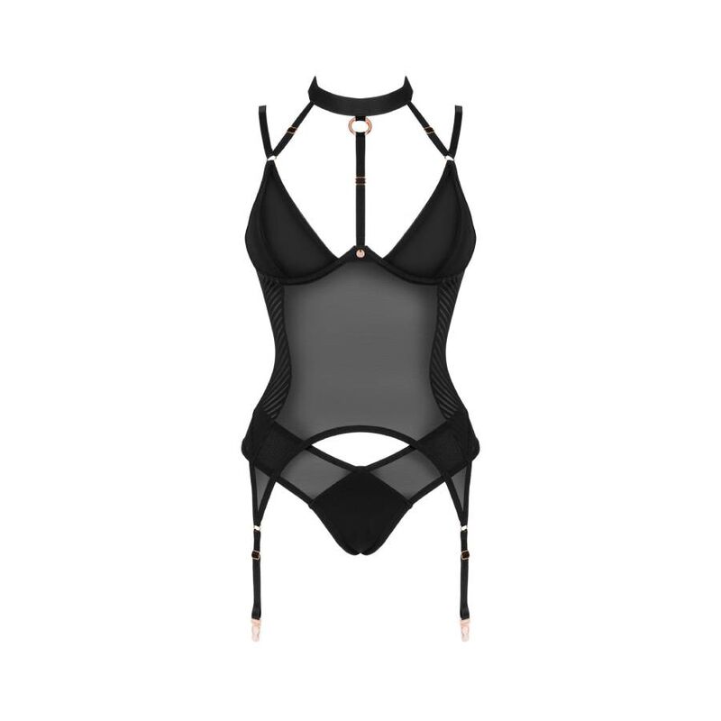 Buste parfaitement mis en valeur, jolie coupe, culotte assortie. Détails en or rose, fermeture bijou sur la nuque et bride amovible à l’entre-sein, tous ces éléments se combinent pour créer un accessoire de séduction irréprochable, comme on l’aime…