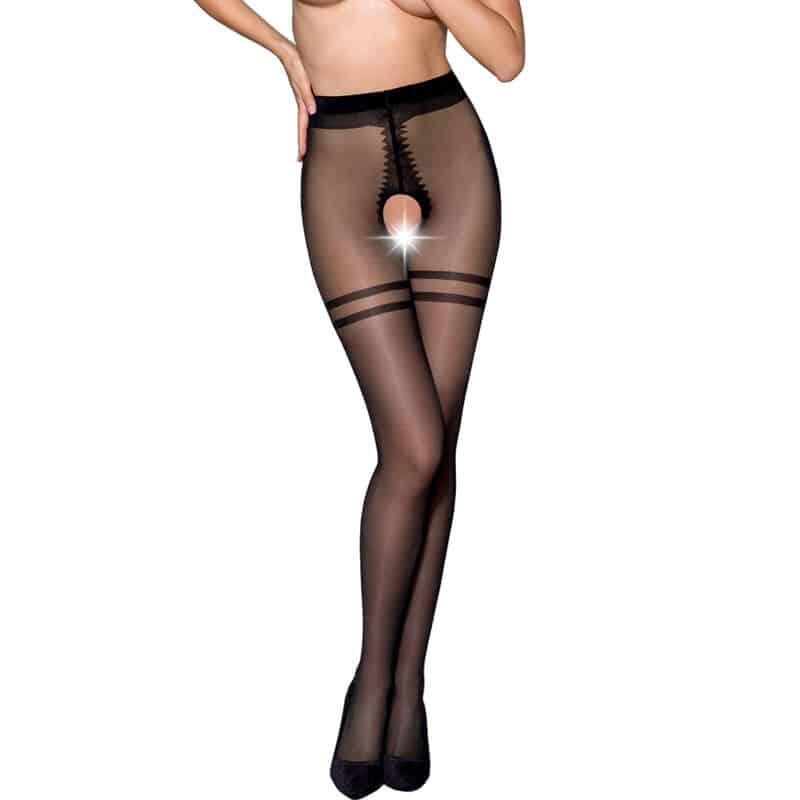 Bas élégants avec une ouverture entre les cuisses et une décoration intéressante. Le modèle s’adapte parfaitement à la silhouette.