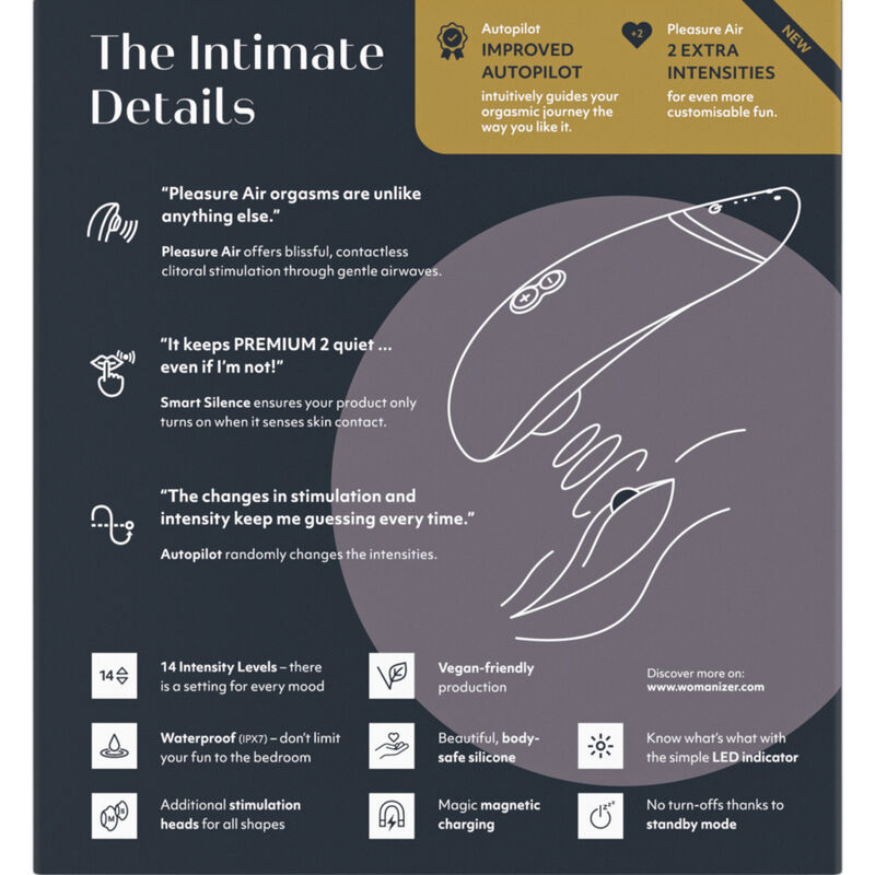 Le Womanizer Premium 2 a amplifié son jeu avec plus de niveaux d’intensité que jamais et une fonction de pilote automatique améliorée pour vous emmener dans la course de votre vie. Avec la technologie originale Pleasure Air, c’est le jouet ultime pour les femmes qui recherchent plus qu’un simple appareil avec lequel jouer.